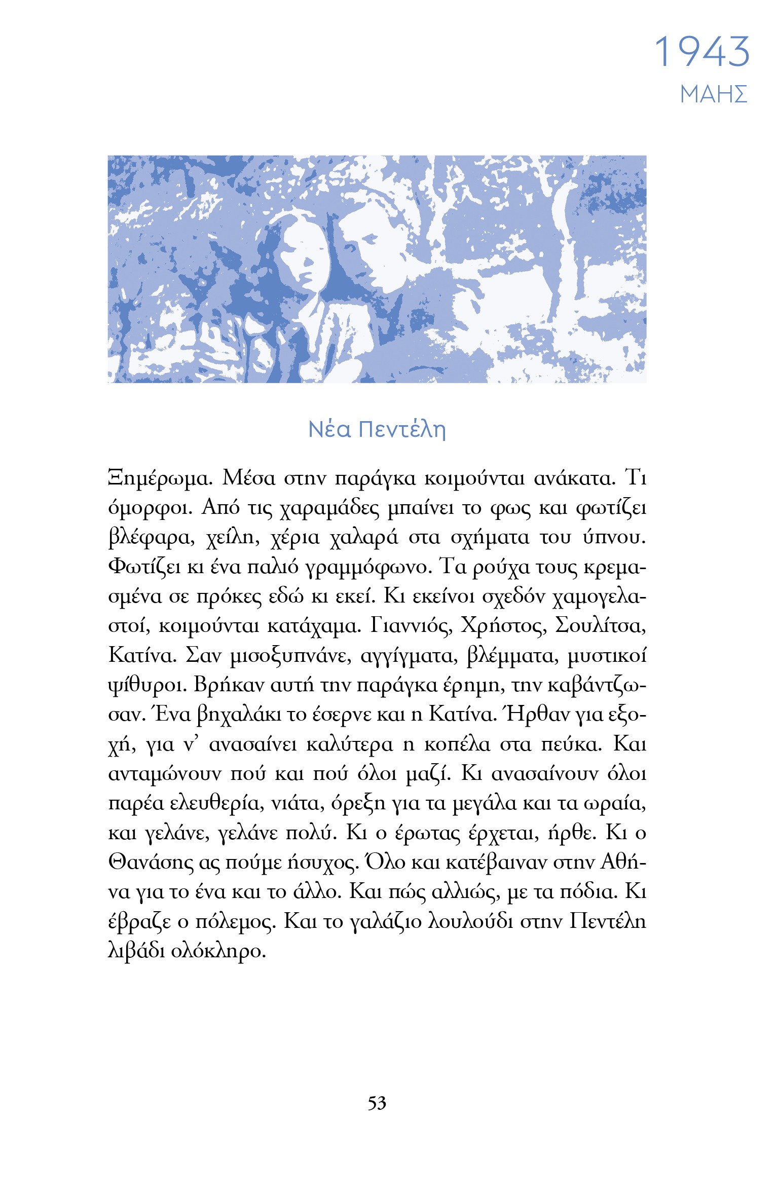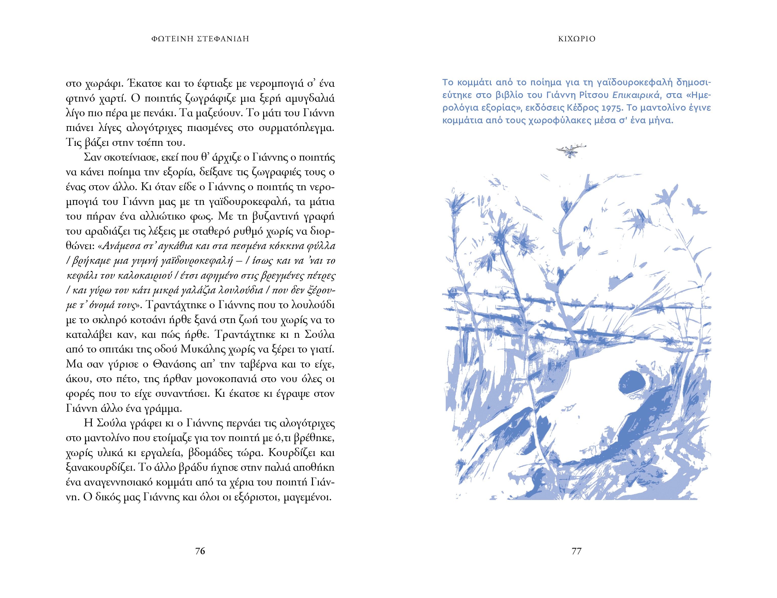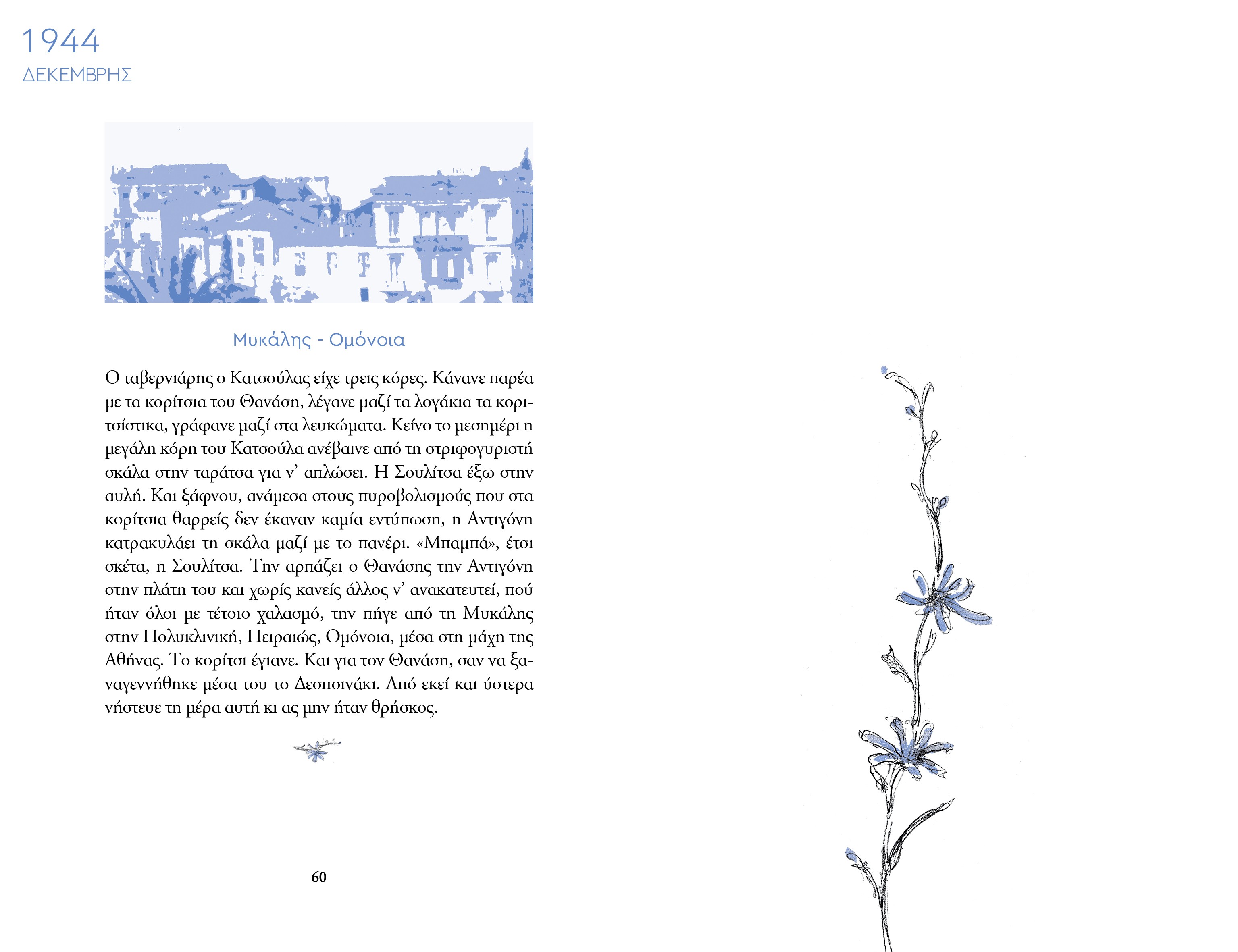 «Βαδίζουν οι δυο τους πλάι πλάι χωρίς να αγγίζονται. Ελαφρά ντυμένοι, η Σούλα μ' ένα φόρεμα λουλουδάτο, ολόκληρη μια άνοιξη για τον Γιάννη, μέσα στην παγωμάρα που ζούσε κι εκείνος και η πατρίδα όλη. Πατώντας στα βήματα που τους όρισε η μοίρα, πέρασαν ανυποψίαστοι έξω από τη Σχολή Οικοκυρικής, εκεί που μάθαινε η Μαρίκα να μπανιαρίζει τα μωρά της μέσα στα δαφνόφυλλα. Με την άκρη του ματιού του το είδε εκείνη τη στιγμή ο Γιάννης το γαλανό κιχώριο να μισοκλείνει τα δυο του λουλούδια, εκεί που το έβλεπε και η Μαρίκα πριν από 25 χρόνια, στου πεζοδρόμιου τη χαραμάδα».