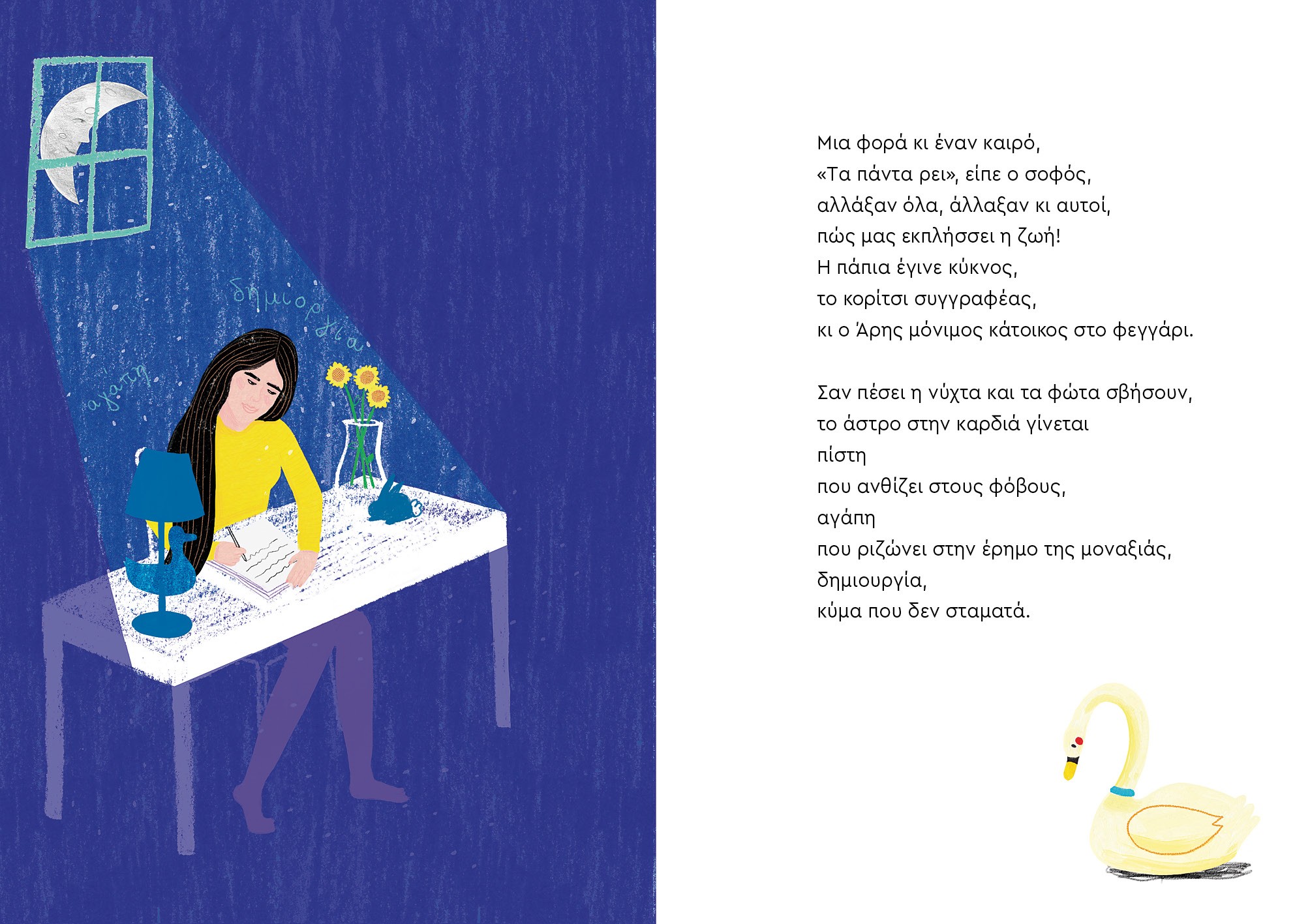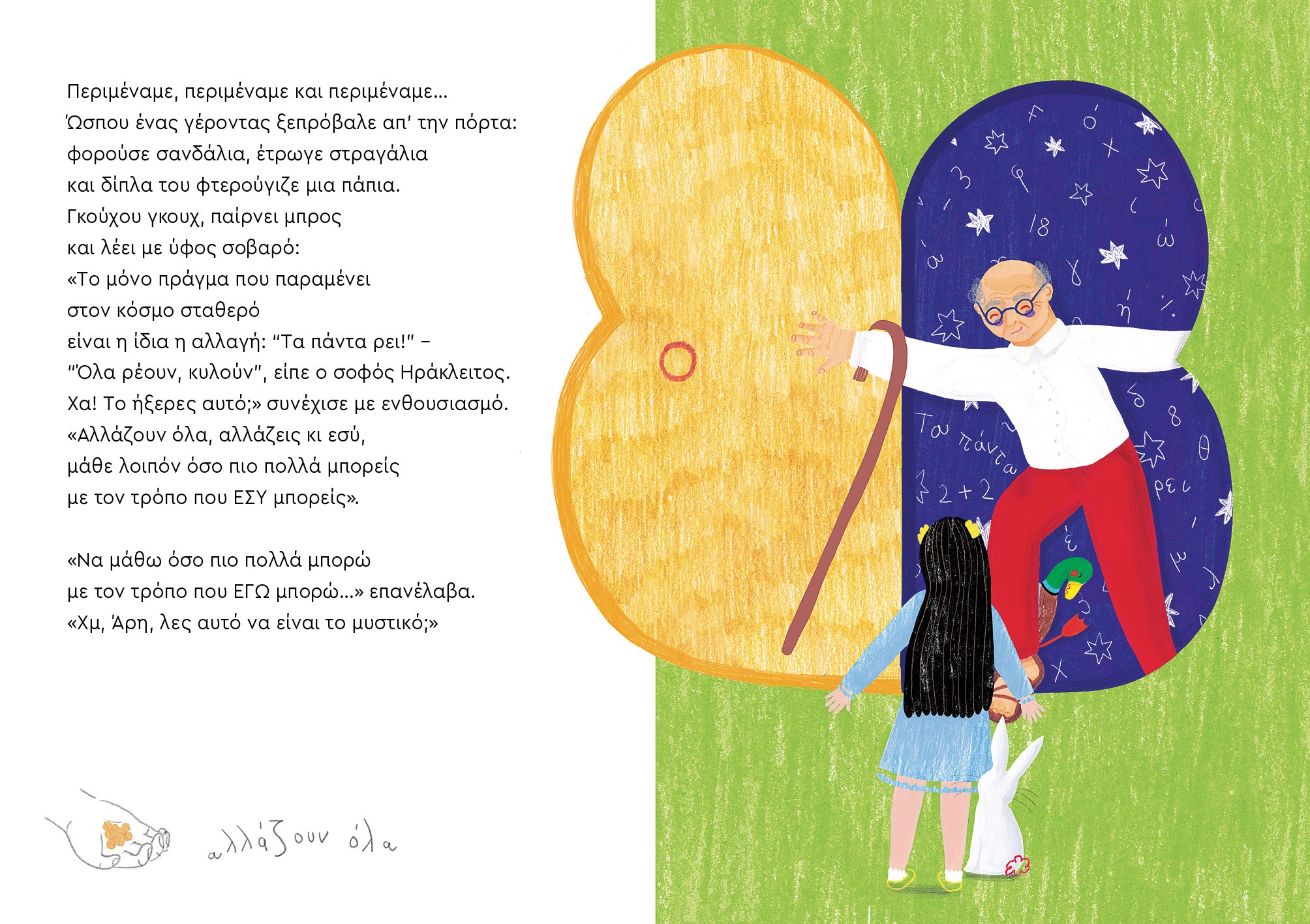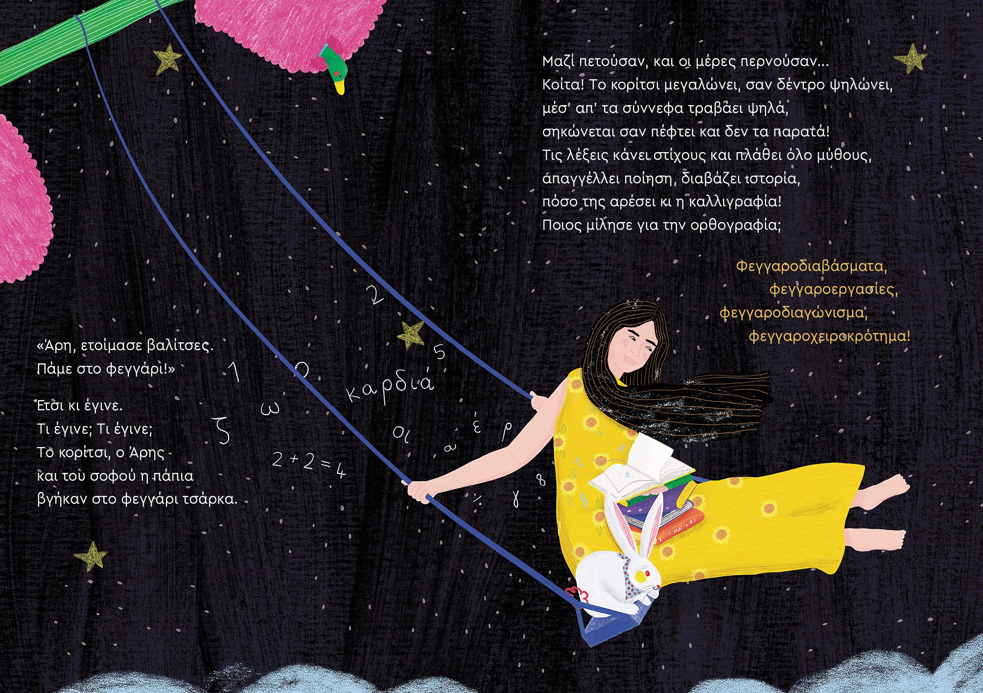 «Μια συγγραφέας που δεν ήξερε να γράφει;;!! Παράξενο. Τότε πώς έγραψε αυτό το βιβλίο;» «Μόνον αυτό; Έχει γράψει κι άλλα. Πάρα πολύ όμορφες ιστορίες. Λέξη λέξη, βήμα βήμα, να πέφτεις και να σηκώνεσαι, με ατέλειωτη υπομονή. Οι άνθρωποι είναι διαφορετικοί, δεν μαθαίνουν όλοι με τον ίδιο τρόπο, ούτε το ίδιο εύκολα. Αλλά παλεύουν και καταφέρνουν πολλά. Σ’ αυτήν εδώ την ιστορία, ας πούμε, που σκάρωσε η συγγραφέας, μας λέει πώς με το κουνέλι της τον Άρη σκαρφάλωσε σκαλί σκαλί και πήγε να βολτάρει στο φεγγάρι!