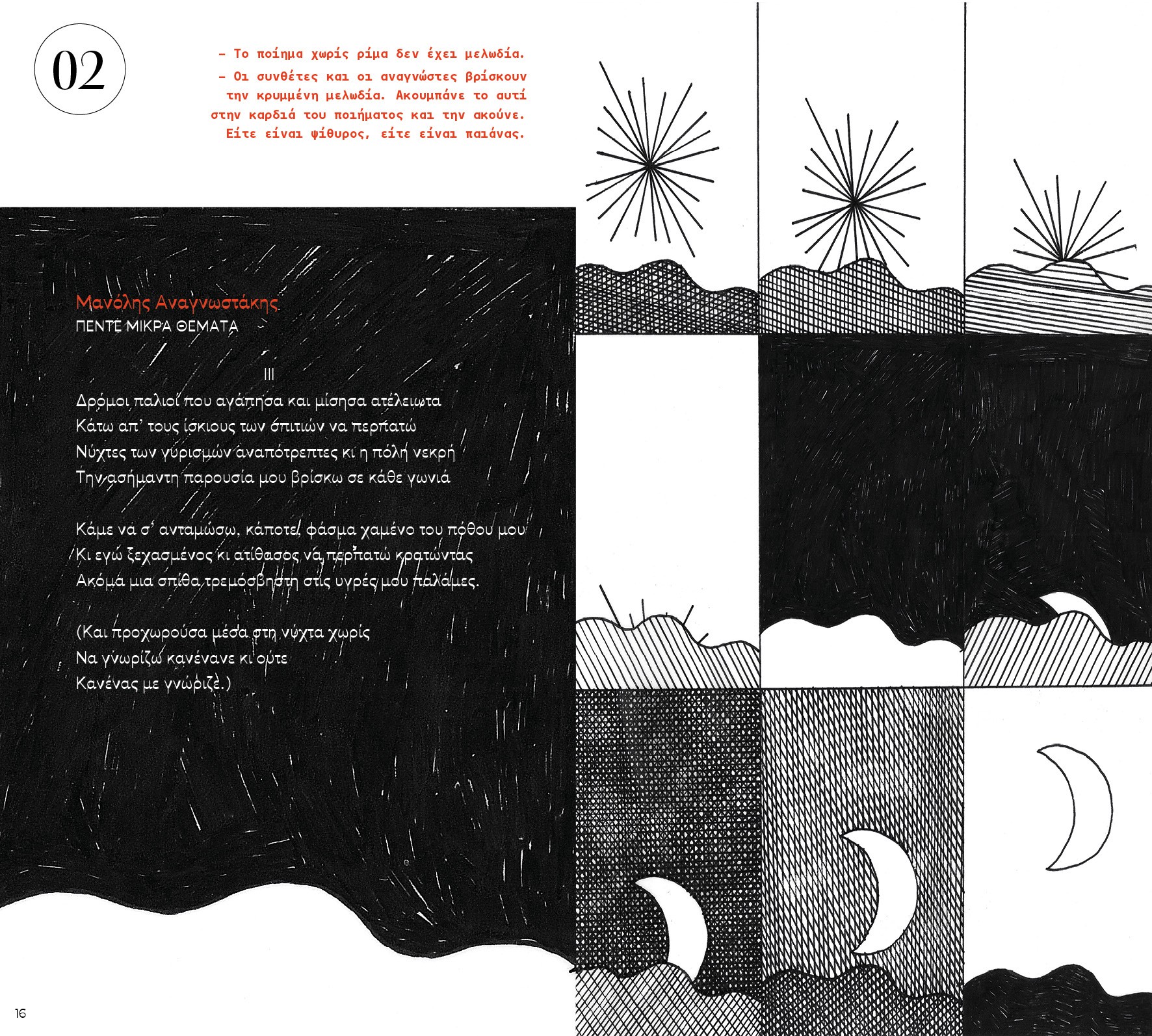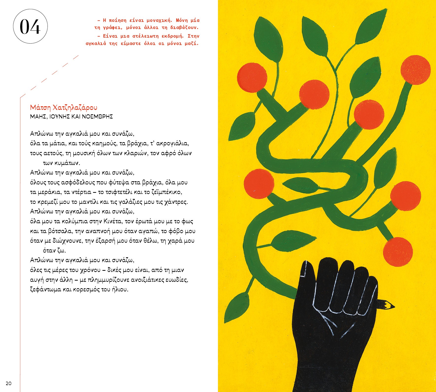 Δεν είναι ανθολογία, μπορείτε να βρείτε πολλές, δεν είναι ποιήματα που πρέπει να ξέρετε – στην τέχνη τίποτα δεν «πρέπει». Είναι ποιήματα που μας κράτησαν το χέρι, ποιήματα που κουλουριάστηκαν δίπλα μας, ποιήματα-δαχτυλίδια που τα φοράμε πάντα. Μπορεί ανάμεσά τους να βρείτε το δικό σας, μπορεί και όχι. Είναι ένας περίπατος σ’ ένα λιβάδι με λουλούδια, σε μια παραλία με κοχύλια, όπου σταθήκαμε και μαζέψαμε μερικά. Αφήσαμε έξω πολλά αγαπημένα. Μπορεί να τα βρείτε εσείς. Ή μπορεί κάτι απ’ αυτά που γράψαμε να σας στείλει σ’ έναν ποιητή και σ’ ένα άλλο ποίημα. Και τότε θα δείτε τον κόσμο να γεννιέται ξανά και ξανά.