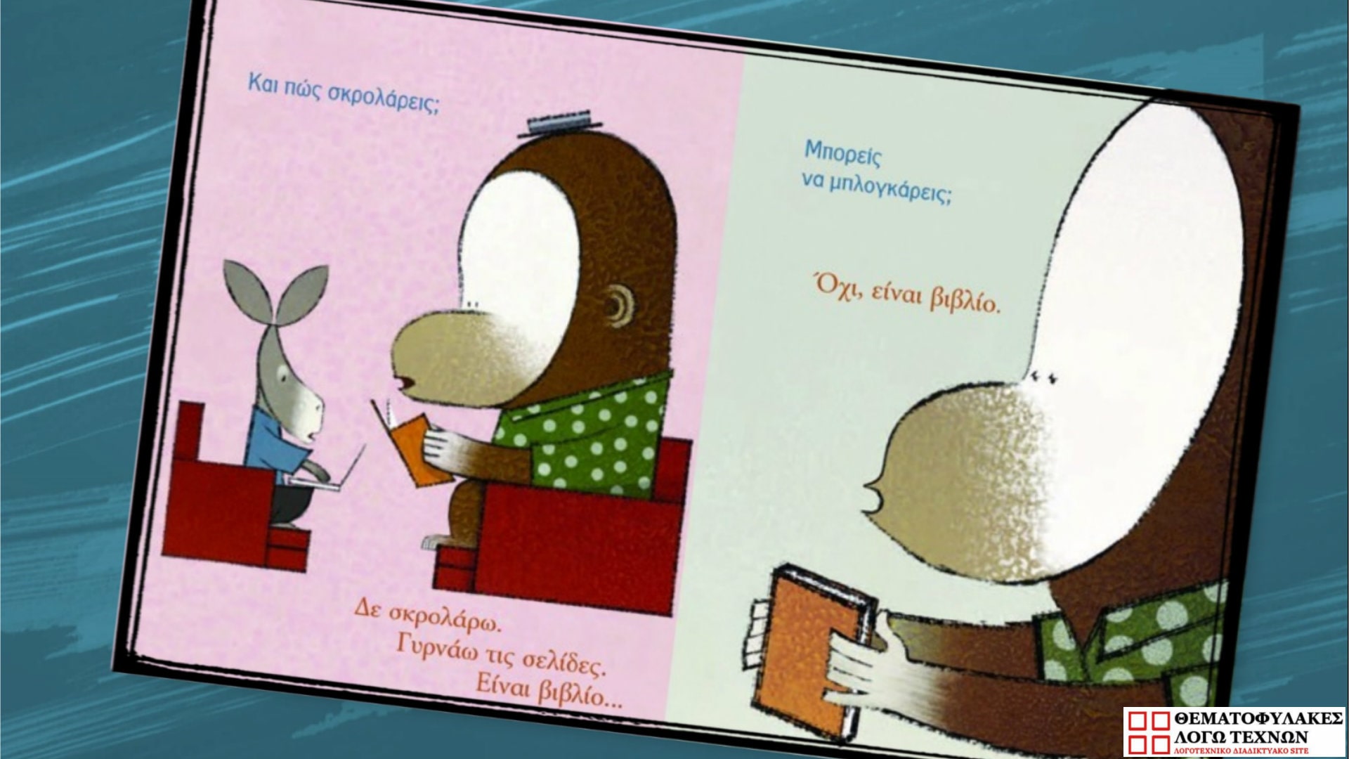Είναι βιβλίο – Lane Smith. Από τις εκδόσεις Καλειδοσκόπιο, κυκλοφορεί ένα απολαυστικό βιβλίο που διαβάζεται ευχάριστα από μικρούς και μεγάλους αναγνώστες. Ένα βιβλίο επίκαιρο όσο ποτέ, σε μια εποχή που τα παιδιά περνούν ατελείωτες ώρες μπροστά σε μια οθόνη, και αφιερώνουν χρόνο μόνο στα σχολικά βιβλία από ανάγκη.