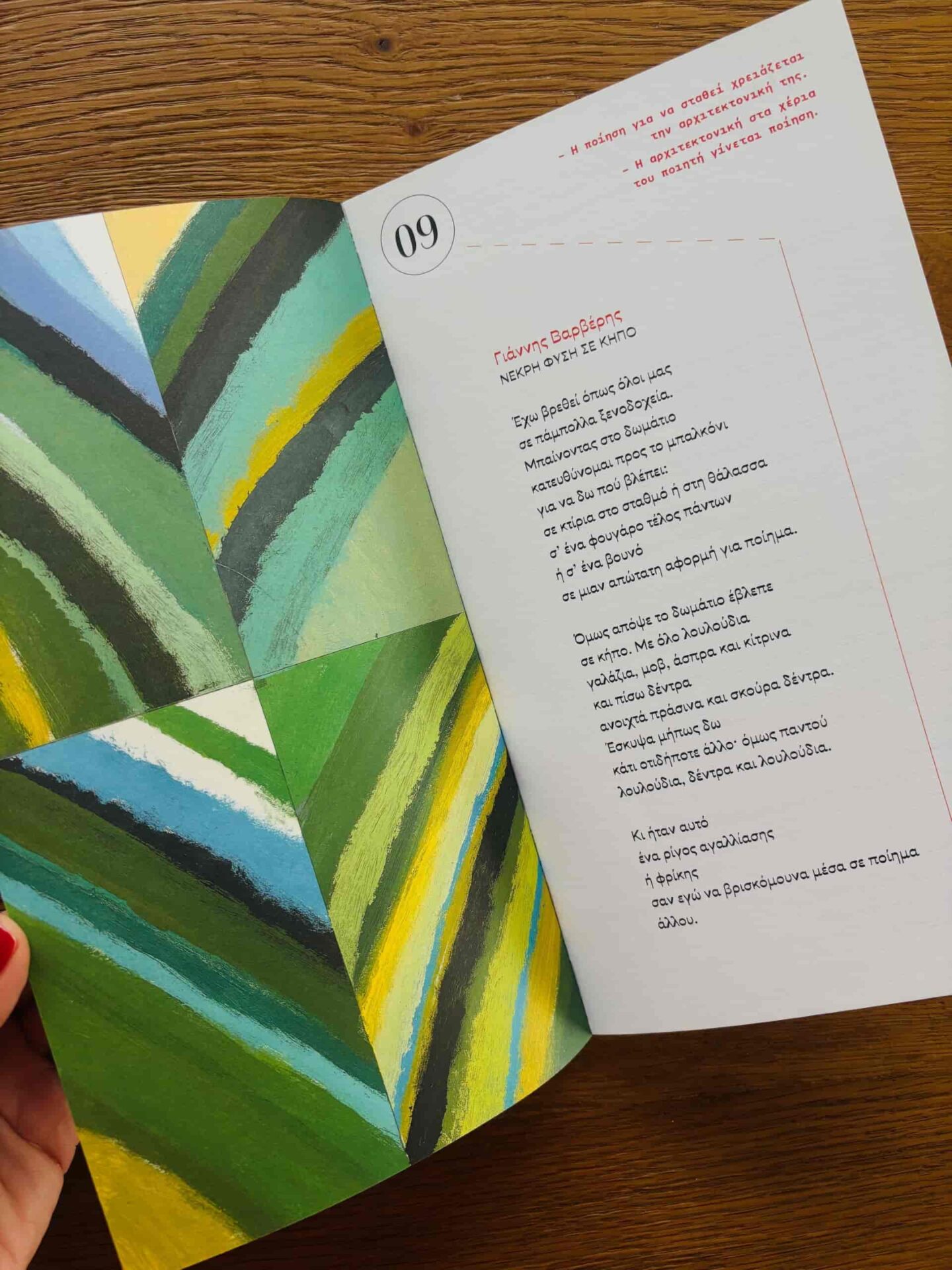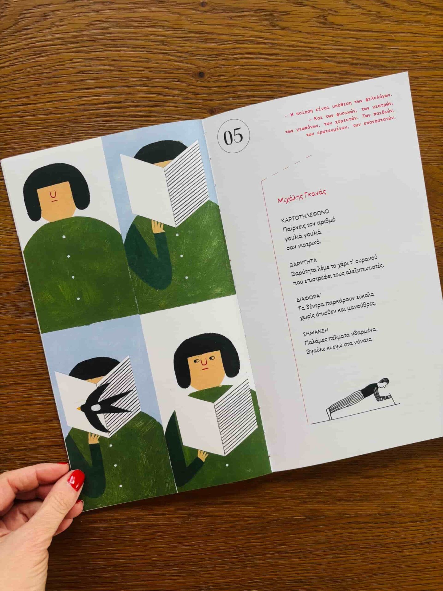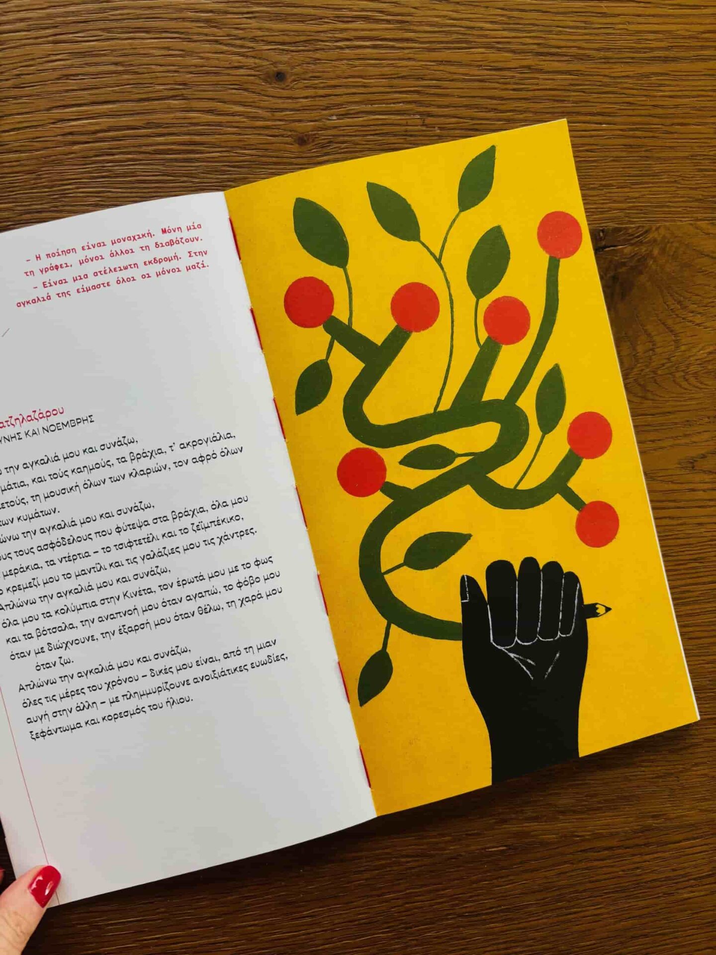 Ένας μικρός διάλογος, σύντομες φράσεις, σαν ψίθυροι ή αντιρρήσεις, γραμμένες με κόκκινα γράμματα. Δεν εξηγούν το ποίημα ούτε το προαναγγέλλουν. Ανοίγουν μόνο μια μικρή χαραμάδα στο βλέμμα πριν εμφανιστούν οι στίχοι. Έτσι, ένα ποίημα του Καρυωτάκη, του Αναγνωστάκη, του Εμπειρίκου, του Σεφέρη, του Ρίτσου, του Ελύτη ή της Αγγελάκη-Ρουκ και της Μάτσης Χατζηλαζάρου μοιάζει με μια απάντηση σε έναν ζωντανό διάλογο γύρω από το τι είναι τελικά η ποίηση και τι μπορεί να σημαίνει για τον καθένα μας. Τα ποιήματα που συναντάμε στις σελίδες του βιβλίου δεν είναι τα πιο γνωστά, ούτε επιλέγονται ως αντιπροσωπευτικά μιας συγκεκριμένης περιόδου, θεματικής ή υφολογικής κατηγορίας.