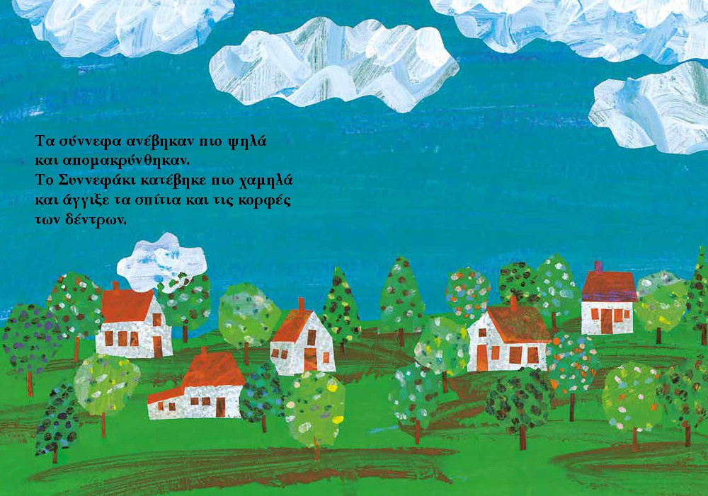 Όταν όλα τα σύννεφα γλιστρούν αργά ψηλά στον ουρανό, το Συννεφάκι καθυστερεί, κατεβαίνει πιο χαμηλά για ν’ αγγίξει τα σπίτια και τις κορφές των δέντρων. Παίζοντας αλλάζει σχήματα, μεταμορφώνεται σε πρόβατο, αεροπλάνο, λαγουδάκι. Κι ύστερα, ενώνεται με τους φίλους του σ΄ ένα μεγάλο σύννεφο για να φέρουν την βροχή.